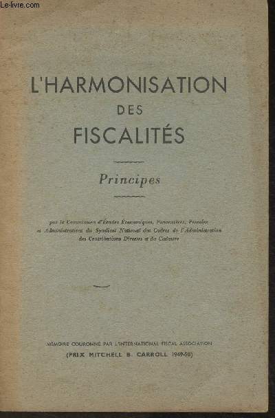 Par la Commission d'Etudes Economiques, Financières, Fiscales et Administratives du Syndicat National des Cadres de l'Administration des Contributions Directes et du Cadastre. Mémoire couronné par l'internationl fiscal association, Prix Mitchell B. Carroll 1949-1950) Classification Dewey : 343-Droit fiscal, commercial, défense