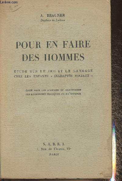 S.A.B.R.I.. 1956. In-8. Broché. Etat d'usage, Couv. défraîchie, Dos fané, Papier jauni. 184 pages. Couverture légèrement désolidarisée. Rares rousseurs dans le texte et sur les plats.. . . . Classification Dewey : 155.4-Psychologie de l'enfant