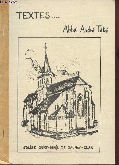 Eglise Saint-Denis de Jaunay-Clan. Non daté. In-4. Broché. Etat d'usage, Livré sans Couverture, Dos abîmé, Intérieur frais. Environ 40 pages. Traces d'adhésifs sur les plats. Agrafes partiellement enlevées. Pas de dos, feuillets agrafés.. . . . Classification Dewey : 840.8-Anthologies, recueils