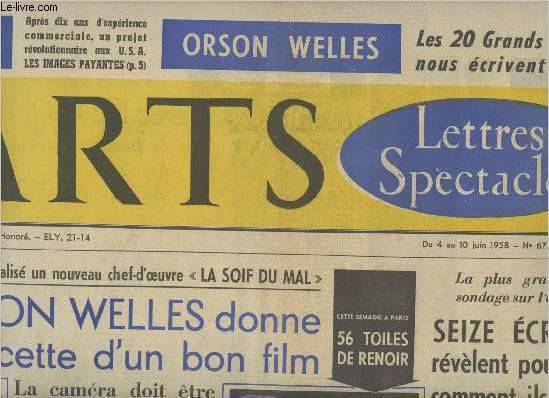 Sommaire: Orson Welles donn la recette d'un bon film- 16 écrivains révèolent pourquoi et comment ils écrivent- avec Carco s'en va le charme de Montmartre- La TV drogue l'Amérique- 20 grands du théâtre mondial répondent à l'enquête de Maurice Kurtz- etc. Classification Dewey : 70.1-Journaux