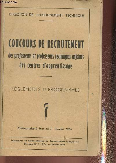 Centre national de Documentation pédagogique. 1956. In-12. Broché. Etat d'usage, Coins frottés, Agraffes rouillées, Papier jauni. 126 pages. Nombreuses rousseurs.. . . . Classification Dewey : 370-Education