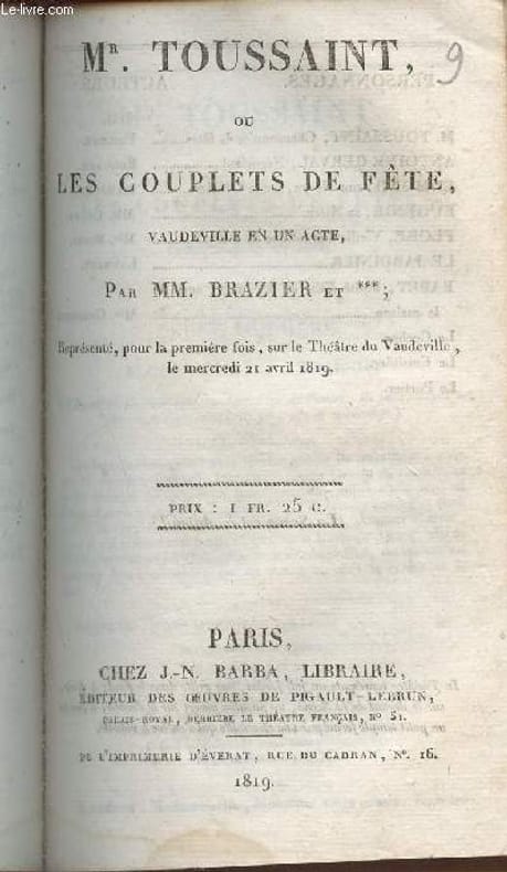Chez J.N. Barba. 1819. In-12. Broché. Etat d'usage, Livré sans Couverture, Dos abîmé, Papier jauni. 32 pages. Rousseurs.. . . . Classification Dewey : 792-Théâtre