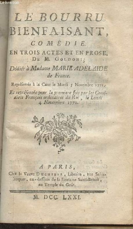 Edition originale de cette comédie représentée devant la cour de France en novembre 1771 et dédiée à madame Marie-Adélaïde. Goldoni, déjà célèbre en Italie, s'était exilé en France en 1762 à la suite d'une proposition des Comédiens italiens du Roi. Il était chargé d'enseigner l'italien aux filles de Louis XV. Sa dédicace à Marie-Adélaïde commence ainsi : "Aussitôt que j'ai vu la France je l'ai admirée, je l'ai aimée, & je n'aurois pu la quitter, qu'avec le plus grand regret". Soleinne, 2154.