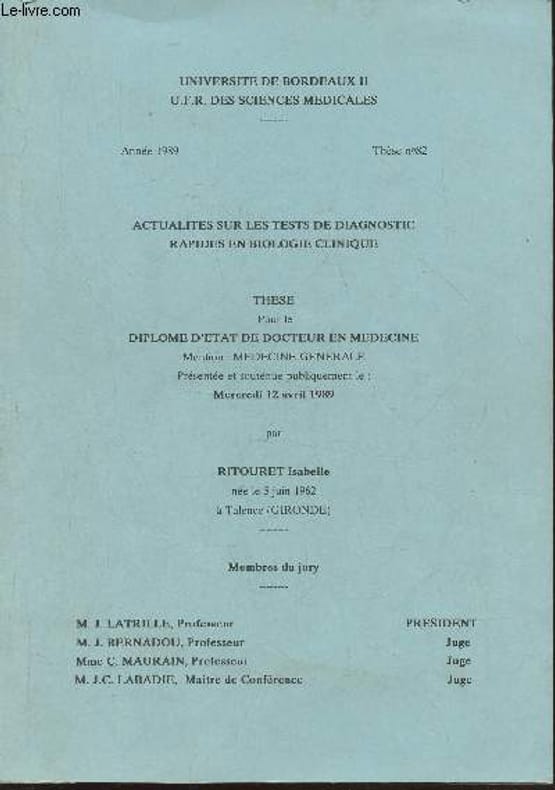 Université de Bordeaux II/U.F.R. des sciecnes médiclaes. 1989. In-4. Broché. Bon état, Couv. légèrement passée, Dos satisfaisant, Papier jauni. 124 pages. Quelques rousseurs. Coins frottés.. . . . Classification Dewey : 610-Sciences médicales. Médecine