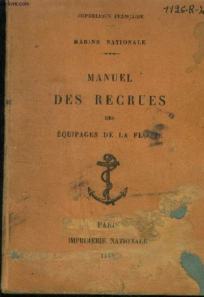 Paris imprimerie nationale. 1945. In-12. Broché. Etat d'usage, 1er plat abîmé, Dos plié, Intérieur frais. 192 pages.. . . . Classification Dewey : 386-Marine