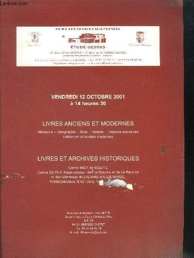 HOTEL DES VENTES PAU PYRENEES / GESTAS. 2001. In-4. Broché. Etat d'usage, 1er plat abîmé, Dos satisfaisant, Quelques rousseurs. 47 pages.. . . . Classification Dewey : 56-Catalogue