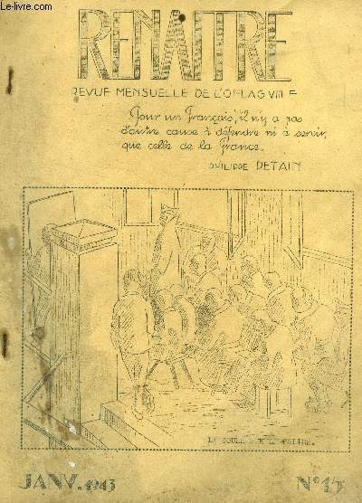 "RARE - ""Revue mensuelle de l'OFLAG. VIII F"" par les prisonniers du camp de Oflag VIII. ""Pour un francais, il n'y a pas d'autre cause a defendre ni a servir, que celle de la france, petain"" -""Un pays battu, s'il sait s'unir est un pays qui renait. Vive la france!"" - SOMMAIRE : plus que jamais- communications- robert fournel- l'etat francais- banderilles: histoire de cuisine- salon d'hiver- voyage aux cuisines- le theatre par pierre tisseyre- les spectacles par robert douce- bridge par eugene conti. Classification Dewey : 70.49-Presse illustrée, magazines, revues"