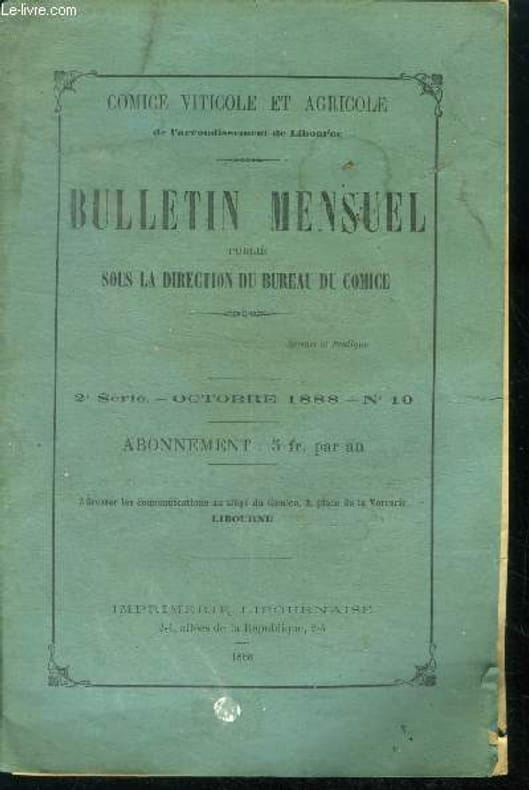 bureau du comice. 1888. In-8. En feuillets. Bon état, Tâchée, Dos satisfaisant, Quelques rousseurs. Paginé de 111 à 122 + un supplément d'une page. - couverture volante.. . . . Classification Dewey : 908.447-Régionalisme : Aquitaine