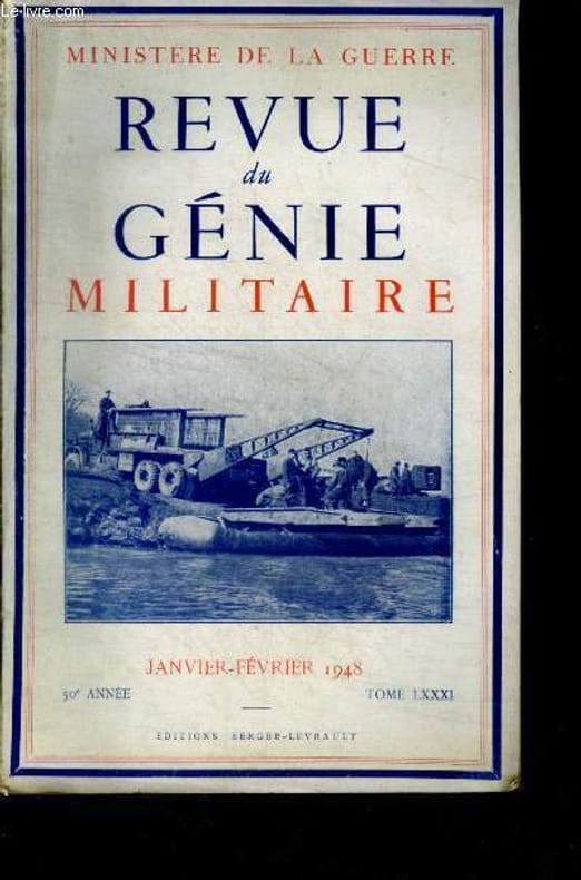 SOMMAIRE : le general hellot, organisation et fonctionnement du genie (troupe et services) en indochine ( par le lieutenant colonel houssay) , les materiels de franchissement de breches et de cours d'eau ( par le capitaine perraud), le depot des plans et archives de la direction regionales du genie de lille ( par le colonel dardonville), les ponts de maximiliensau ( par la capitaine gillois) Classification Dewey : 70.49-Presse illustrée, magazines, revues