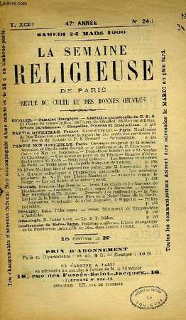La Semaine Religieuse de Paris. 1900. In-8. En feuillets. Etat d'usage, Couv. légèrement passée, Dos abîmé, Intérieur bon état. Paginé de 414 à 456. Tampon et annotation sur le 1er plat. Pages légèrement passées.. . . . Classification Dewey : 260-Théologie sociale chrétienne