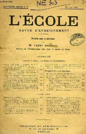 A nos lecteurs. Pensées chrétiennes. Langue française. Histoire. Mathématiques. Sciences physiques et naturelles. Dessin. Education physique. Epreuves d'examens au CEP... Années scolaires allant de spet. à juillet. 1913, n° 42. 1917-18, 2 vol., avec Tables. 1926-27, 2 vol., dont la 'Partie supérieure'. 1927. 1928. 1929. 1933. 1935. 1936. 1937. 1938. 1939. 1940. 1941. 1942. 1943 (jusqu'en avril). Classification Dewey : 370-Education