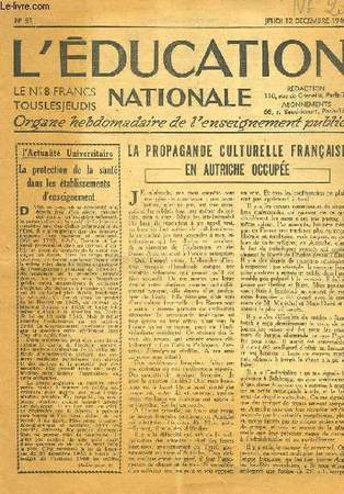 L'Education Nationale. 1946-1957. In-4. Broché. Bon état, Couv. légèrement passée, Dos satisfaisant, Intérieur bon état. 1 volume relié (1947), avec reliure signée Institut Catholique de Toulouse. 3 numéros de l'année 1946, et 10 années d'env. 40 numéros chacune. Etiquette annotée sur le dos du volume relié. Quelques tampons et annotations sur les 1ers plats des revues.. . . . Classification Dewey : 370-Education