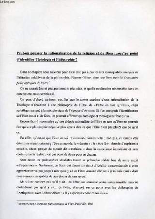 'Dans ce chapitre nous suivrons pour ainsi dire pas à pas les très remarquables analyses de l'historien médiéviste de la philosophie, Etienne Gilson, dans son livre intitulé 'Constantes philosophies de l'Etre'.' (...) Classification Dewey : 210-Philosophie et théorie