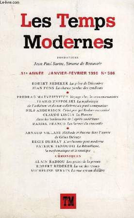Fondateurs: J.P. Sartre, Simone de Beauvoir. R. Redeker, La grève de décembre. J. Pons, La chance perdue des syndicats. C. Liscia, La Havane dans les lendemains de l'après-soviétisme. R. Debray, l'archaïsme post-moderne... Classification Dewey : 100-PHILOSOPHIE ET DISCIPLINES CONNEXES