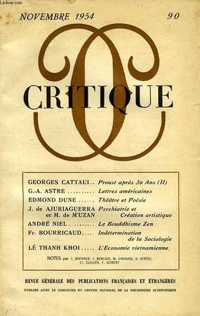 Critique. 1954. In-8. Broché. Bon état, Couv. convenable, Dos satisfaisant, Intérieur frais. Paginé de 918 à 1010.. . . . Classification Dewey : 300-SCIENCES SOCIALES