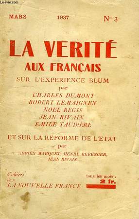 Cahiers de la Nouvelle France. 1937. In-12. Broché. Etat d'usage, Plats abîmés, Dos frotté, Intérieur bon état. Paginé de 130 à 192.. . . . Classification Dewey : 320-Science politique