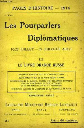 L'ultimatum autrichien et la note responsive serbe - télégrammes du Tsar et du Prince Régent de Serbie - correspondance de M.Sazanoff ministre russe des affaires étrangeres avec les représentants du Tsar à l'étranger et les ambassadeurs étrangers à Petersbourg - déclaration de guerre de l'Allemagne et de l'Autriche à la Russie. Classification Dewey : 940.3-Première Guerre mondiale 1914-1918