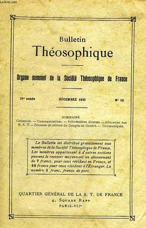 Société Théosophique de France. 1930. In-8. Broché. Etat d'usage, 2ème plat abîmé, Coiffe en pied abîmée, Intérieur acceptable. Paginé de 250 à 273.. . . . Classification Dewey : 299-Autres religions, théosophie