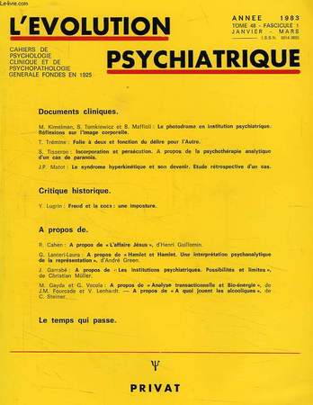 M. Kimelman, S. Tomkiewicz, B. Maffioli, Le photodrame en institution psychiatrique, Réflexions sur l'image corporelle. T. Trémine, Folie à deux et fonction du délire pour l'autre. Y. Lugrin, Freud et la coca: une imposture... Classification Dewey : 619.89-Psychiatrie