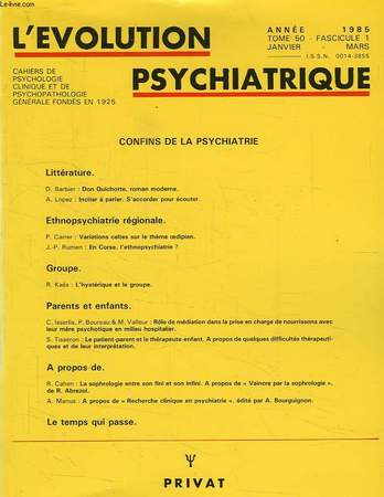 Confins de la psychiatrie. D. Barbier, Don Quichotte, roman moderne. P. Carrer, Variations celtes sur le thème oedipien. R. Kaës, L'hystérique et le groupe... Classification Dewey : 619.89-Psychiatrie