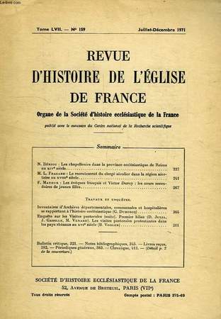 N. Bériou, Les chapellenies dans la province ecclésiastique de Reims au XIVe siècle. F. Mayeur, Les evêques français et Victor Duruy: les cours secondaires de jeunes filles. Enquête sur les visites pastorales (suite)... Classification Dewey : 270-Histoire et géographie de l'Eglise