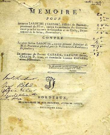 Fructidor XIII. En présence de Pierre Cazade, Cazade jeune, Cazade 3e frère, et demoiselle Ursule Cazade, aussi Défendeurs. Classification Dewey : 340-Droit