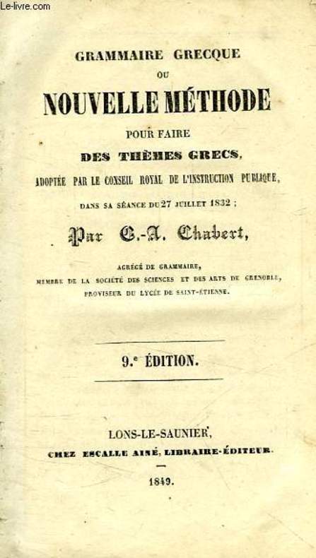Chez Escalle Aîné, Lons-le-Saunier. 1849. In-12. Relié. Etat du neuf, Plats abîmés, Coiffe en pied abîmée, Quelques rousseurs. 330 pages. Couverture muette se détachant. Dessin au crayon au dos du 1er plat.. . . . Classification Dewey : 480-Langues helléniques. Grec