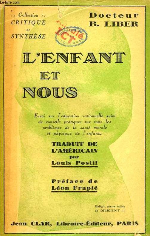 Collection 'Critique et synthèse'. Trad. de l'américain par Louis Postif. Préface de Léon Frapié. Essai sur l'éducation rationnelle suivi de conseils pratiques sur tous les problèmes de la santé morale et physique de l'enfant. Classification Dewey : 155.4-Psychologie de l'enfant