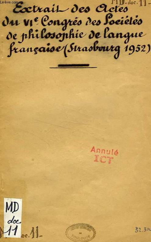 Extrait des Actes du VIe Congrès des Sociétés de Philosophie de langue française (Strasbourg 1952). Classification Dewey : 100-PHILOSOPHIE ET DISCIPLINES CONNEXES