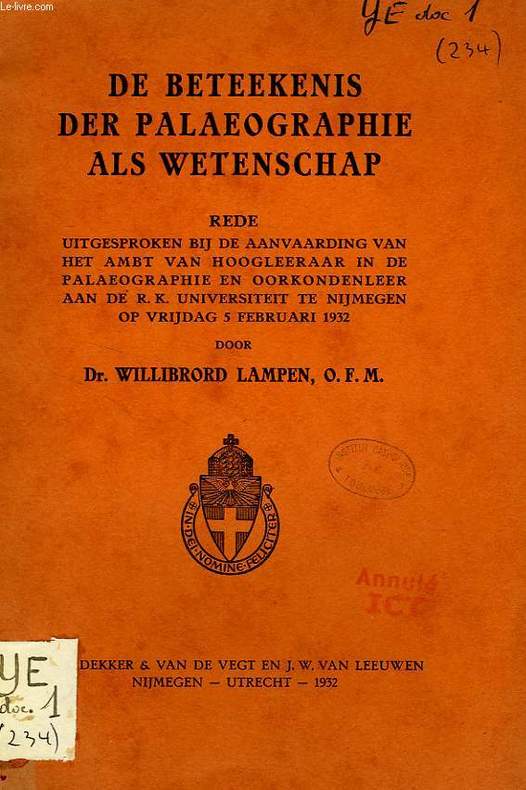 Uitgesproken bij de aanvaarding van het ambt van hoogleeraar in de palaographie en oorkondenleer aan de R.K. Univ. te Nijmegen op vrijdag 5 feb. 1932. Classification Dewey : 490-Autres langues