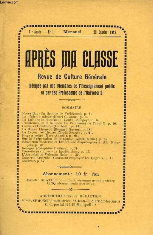 Après ma Classe. 1929. In-8. Broché. Bon état, Couv. légèrement pliée, Dos satisfaisant, Intérieur acceptable. Plaquette de 48 pages.. . . . Classification Dewey : 370-Education