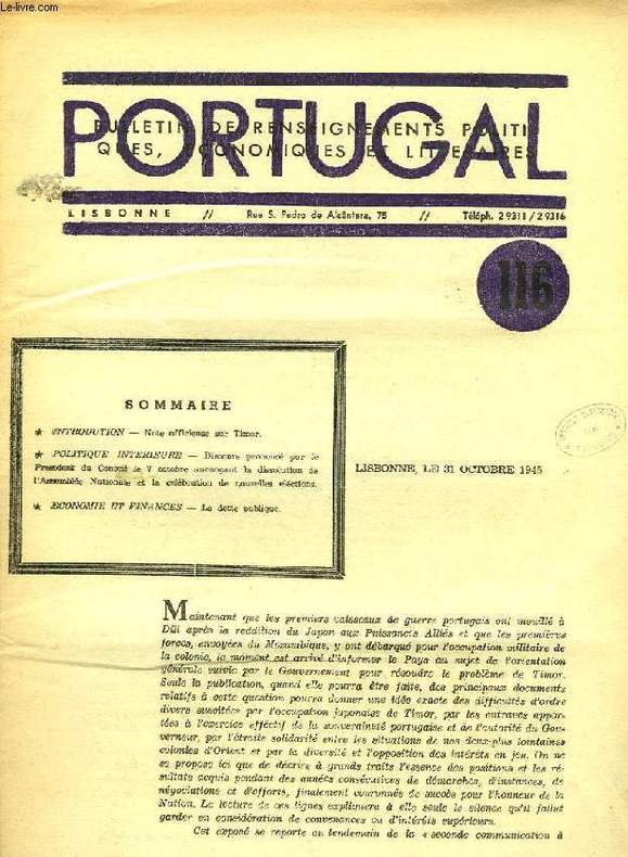 Note officieuse sur Timor. Discours du Président du Conseil. Propagande électorale... Classification Dewey : 946-Espagne, Portugal