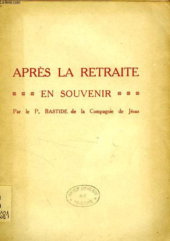 Maison des Retraites, La Bastiolle. 1919. In-12. Broché. Bon état, Couv. convenable, Dos frotté, Non coupé. Plaquette de 44 pages. Etiquette de code sur le dos. Tampons de bibliothèque sur le 1er plat et en page de titre. Couverture se détachant légèrement.. . . . Classification Dewey : 248-Vie chrétienne et méditations