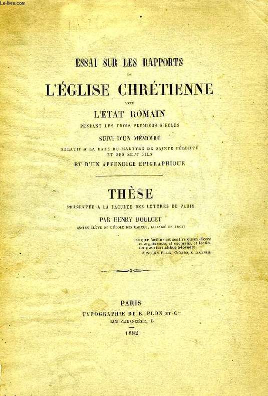 Thèse prés. à la faculté des Lettres de Paris. Suivie d'un Mémoire relatif à la date du martyre de sainte Félicité et ses sept fils et d'un Appendice épigraphique. Classification Dewey : 270-Histoire et géographie de l'Eglise