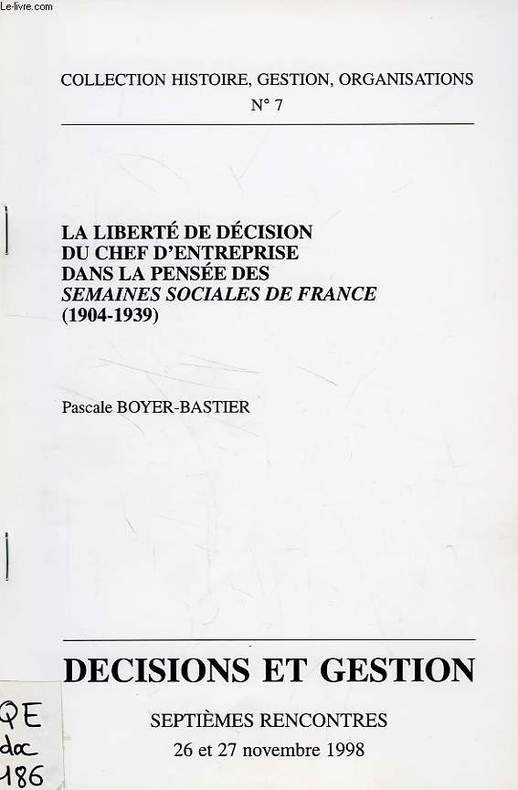 Décisions et Gestion, 7e rencontres, nov. 1998. Collection Histoire, Gestion, Organisation n° 7. Classification Dewey : 658-Gestion des entreprises privées et publiques
