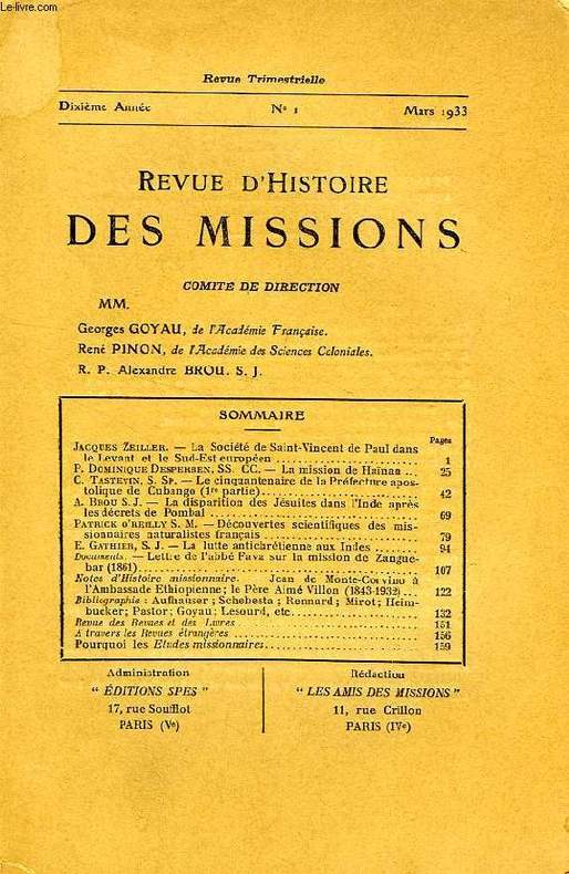 J. Zeiller, La Société de Saint-Vincent de Paul dans le Levant et le Sud-Est européen. P. Dominique Desperben, La mission de Haïnan. P. O'Reilley, découvertes scientifiques des missionnaires naturalistes français... Classification Dewey : 270-Histoire et géographie de l'Eglise