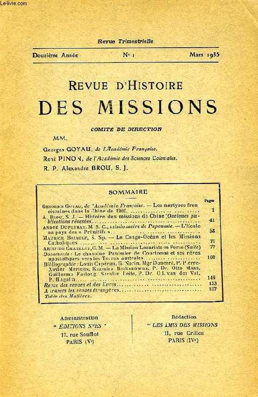 G. Goyau, Les martyres français dans la Chine de 1900. A. Dupeyrat, Missionnaire de Papouasie, L'Ecole au pays des 'primitifs'. A. Chatelet, La Mission Lazariste en Perse (suite)... Classification Dewey : 270-Histoire et géographie de l'Eglise