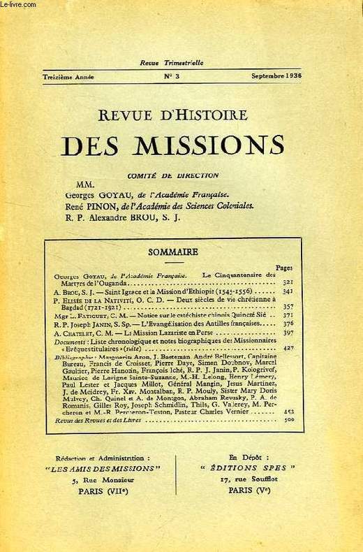 G. Goyau, Le Cinquantenaire des martyrs de l'Ouganda. A. Brou, Saint Ignace et la Mission d'Ethiopie (1545-1556). P. Elisée de la Nativité, Deux siècles de vie chrétienne à Bagdad (1721-1921)... Classification Dewey : 270-Histoire et géographie de l'Eglise