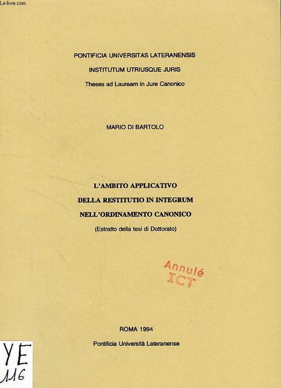 Pontificia Universitas Lateranensis, Institutum Utriusque Iuris, Theses ad Lauream. Estratto della Tesi di Laurea. Classification Dewey : 450-Italien, roumain, rhéto-romain