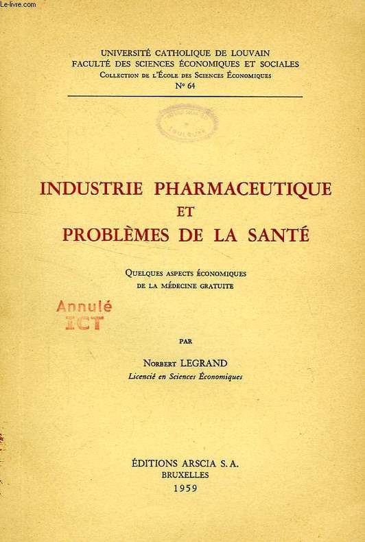 Université Catholique de Louvain, Faculté des Sciences Economiques et Sociales, Collection de l'Ecole des Sciences Economiques, N° 64. L'Industrie pharmaceutique. La consommation de produits pharmaceutiques... Classification Dewey : 614-Santé publique, médecine préventive