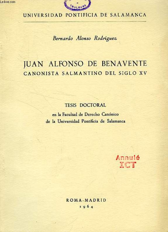Universidad Pontificia de Salamanca. Tesis Doctoral. Consejo Superior de Investigaciones Cientificas Delegacion de Roma, Cuadernos del Instituto Juridico Español, Num. 17. Serie de 'Estudios' en colaboracion con el instituto de Historia de la Teologia de la Univ. Pontificia Salamanca. Classification Dewey : 460-Langues espagnole et portugaise