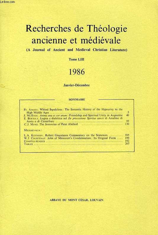 Fr. Amory, Whited Sepulchres: The Semantic History of the Hypocrisy to the High Middle Ages. E. Bertola, Logica et Dialettica nel 'De Processione Spiritus Sancti' di Anselmo di Aosta o di Canterbury... Classification Dewey : 940.1-Moyen-Age