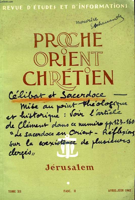 Proche Orient Chrétien. 1962. In-8. Broché. Etat d'usage, Couv. légèrement passée, Coiffe en tête abîmée, Intérieur acceptable. Paginé de 98 à 208. Annotations sur le 1er plat et quelques-unes dans le texte. Coins inférieurs des 30 premières pages découpés et manquants, sans altération de la lecture.. . . . Classification Dewey : 270-Histoire et géographie de l'Eglise