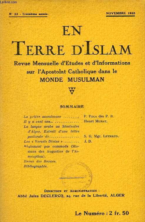 La prière musulmane, P. Foca des P.B. la langue arabe au Séminaire d'Alger, Extrait d'une Lettre pastorale de S.G. Mgr Leynaud. Les 'Versets Divins', J.D. ... Classification Dewey : 270-Histoire et géographie de l'Eglise