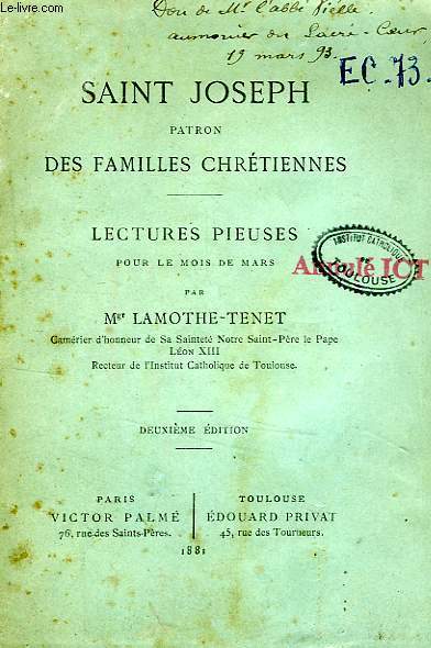 Victor Palmé - Edouard Privat. 1881. In-16. Broché. Etat d'usage, Couv. légèrement passée, Dos abîmé, Intérieur acceptable. 294 pages. Etiquette de code sur le dos. Tampons et annotations de bibliothèque sur le 1er plat et en page de titre. Dos fendu.. . . . Classification Dewey : 235-Les saints