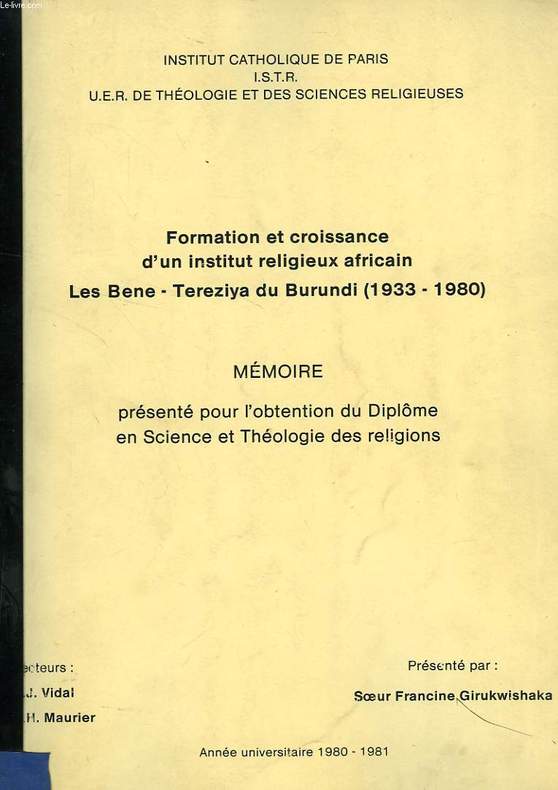 Mémoire de Théologie sous la dir. de P. J. Vidal et P. H. Maurier. Classification Dewey : 270-Histoire et géographie de l'Eglise