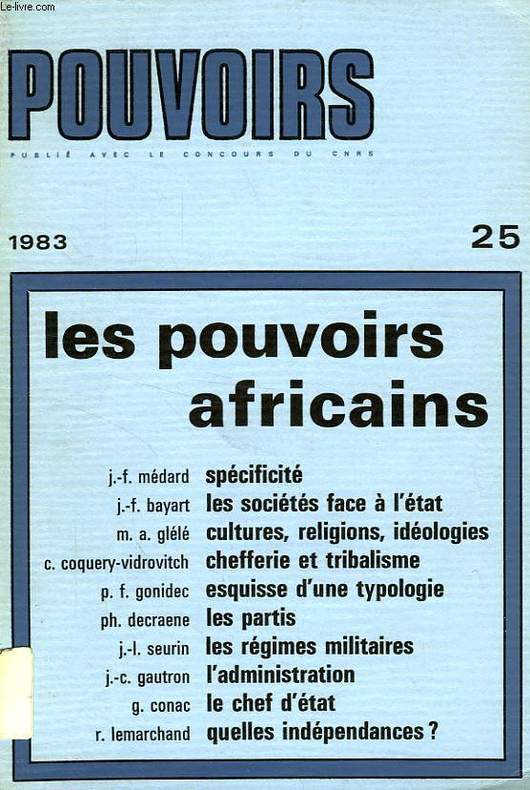 J.F. Médard, Spécificité. J.F. Bayart, Les sociétés face à l'Etat. M.A. Glélé, Cultures, Religions, Idéologies. C. Coquery-Vidrovitch, Chefferie et tribalisme... Classification Dewey : 960-Histoire générale de l'Afrique