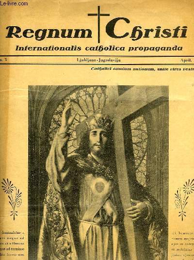 Regnum Christi, Ljubljana. 1937. In-4. En feuillets. Etat passable, Plats abîmés, Dos satisfaisant, Déchirures. 20 pages. Illustré de photos en noir et blanc dans le texte. Texte sur 2 colonnes, en allemand et en français. Pages légèrement jaunies. Feuillets détachés.. . . . Classification Dewey : 270-Histoire et géographie de l'Eglise