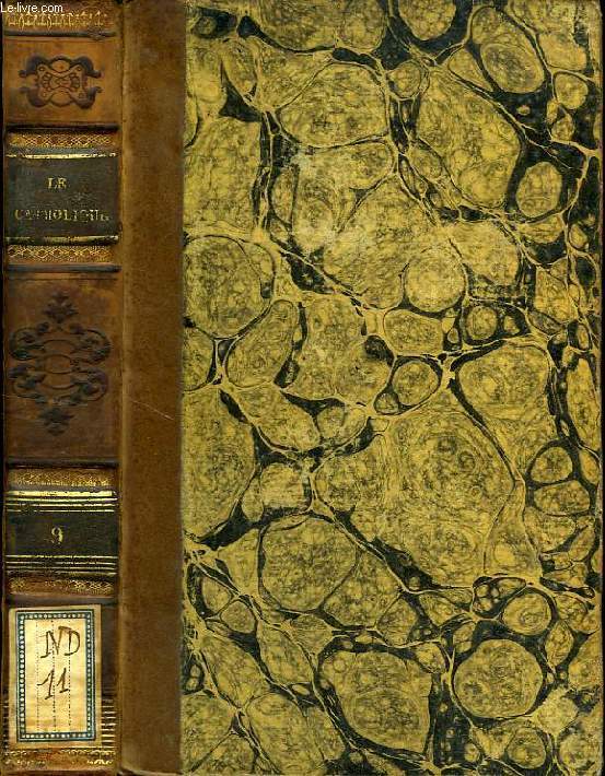 Paris, au Bureau du Mémoirial Catholique 1824-1830, 210x130mm, 225x140mm, demi-veau, titre et ornementations dorés au dos, pièces de tomaisons, les volumes 5 et 6, dos très endommagés, reliures encore solides, reliures de l’époque, volume supplémentaire, cartonnage papier marbré, étiquette de titre manuscrite au dos. Collection complète de cette revue Ultra, une des plus virulentes sous la Restauration, dont un des collaborateurs est l’Abbé La Mennais.