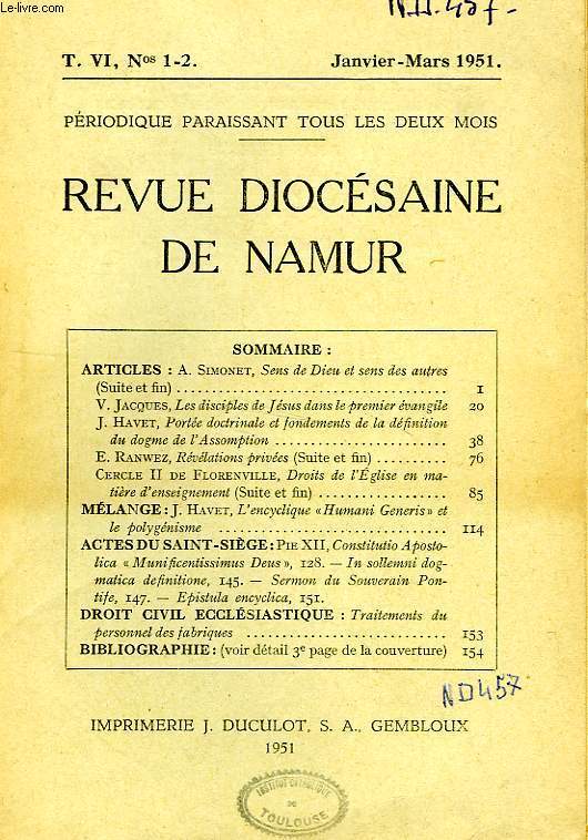 A. Simonet, Sens de Dieu et sens des autres (fin). J. Havet, Portée doctrinale et fondements de la définition du dogme de l'Assomption. J. Havet, L'encyclique 'Humani Generis' et le polygénisme... Classification Dewey : 270-Histoire et géographie de l'Eglise